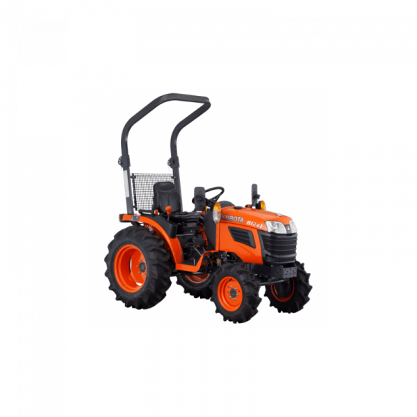 micro-tracteur. Ce tracteur allie taille compacte et maniabilité grâce à sa direction assistée. Il est animé d’une motorisation puissante diesel de 24 ch, le tracteur Kubota B1241 combine donc à la perfection force et maniabilité. En monte pneumatique 5-12/8-16, le B1241 passe partout en offrant une largeur hors tout inférieure à un mètre très appréciable pour les arboriculteurs, les viticulteurs, les pépiniéristes et tous ceux où l’espace est compté! Au travail, la puissance du relevage 3 points et de l’hydraulique, tout comme l’étagement de la transmission 9 AV/3 AR vous simplifient la vie et confortent votre productivité. Plaisant et ergonomique, le B1241 se distingue par son rapport qualité/prix avantageux en version arceau arrière ( B1241 DW) et arceau central ( B1241 DR) Moteur E-TVCS, liquide, 3 cylindres diesel Kubota D1105 24CV Capacité du réservoir de carburant 26 litres 4 roues motrices OU 2 roues motrices Boite à vitesse mécanique 9 av 3 arr Vitesse de déplacement 18.9km/h Blocage de différentiel Direction ASSISTEE Prise de force 540 trs/min avec roue libre pour des accessoires avec forte inertie. SANS Prise de force ventrale pour mettre un plateau de coupe entre les roues avant et arrière Pompe hydraulique de 16.9l/min Capacité de relevage de 615kg aux rotules Longueur 241cm Largeur 99cm Rayon de braquage 210cm Poids 787kg Arceau Arrière Rétroviseur Attelage avant homologué Bloc de commande de sortie hydraulique simple effet