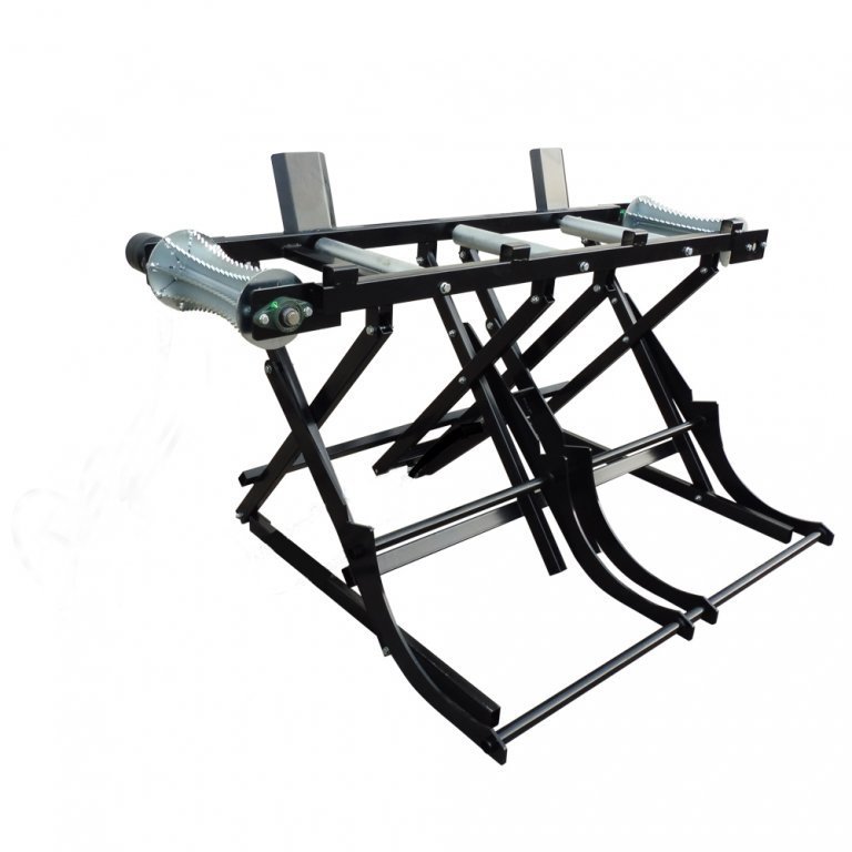 Table élévatrice avec panier lève bûches et rouleau d’alimentation hydraulique.