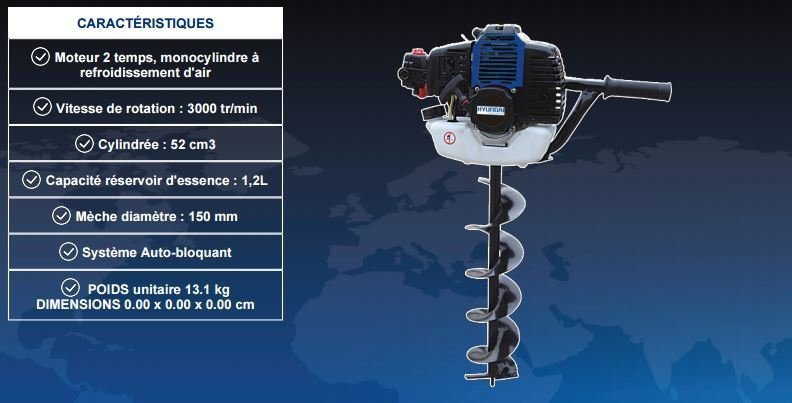 La tarière thermique de chez Hyundai est munit d’un moteur thermique de 52 cm3 et est fournit avec une mèche de 15 cm de diamètre.